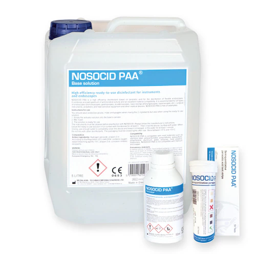 NOSOCID PAA is a high level disinfectant especially formulated for the cold sterilization of thermosensitive instruments and endoscopes. It is based on a synergy of peracetic acid and hydrogen peroxide.